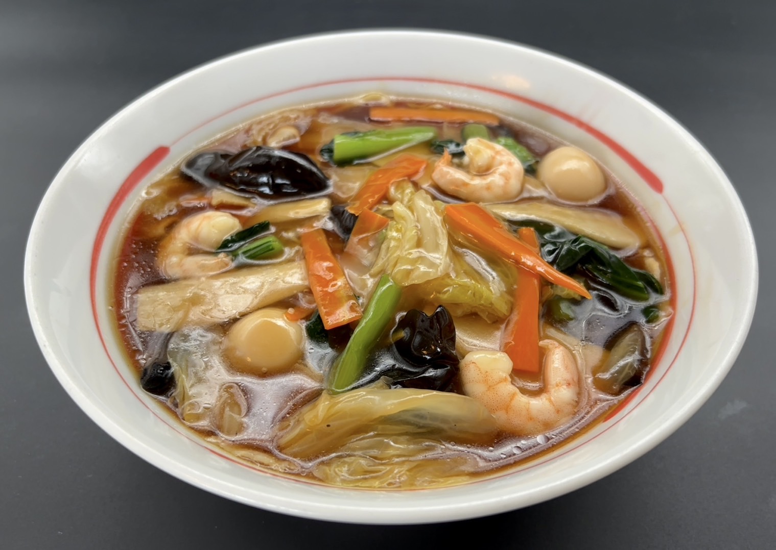 麺の上にはあんをまとった豚肉・エビ・うずらの卵と白菜・木耳・小松菜・人参などの野菜もたっぷりと乗せた具沢山の広東麺。